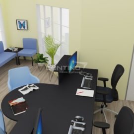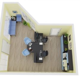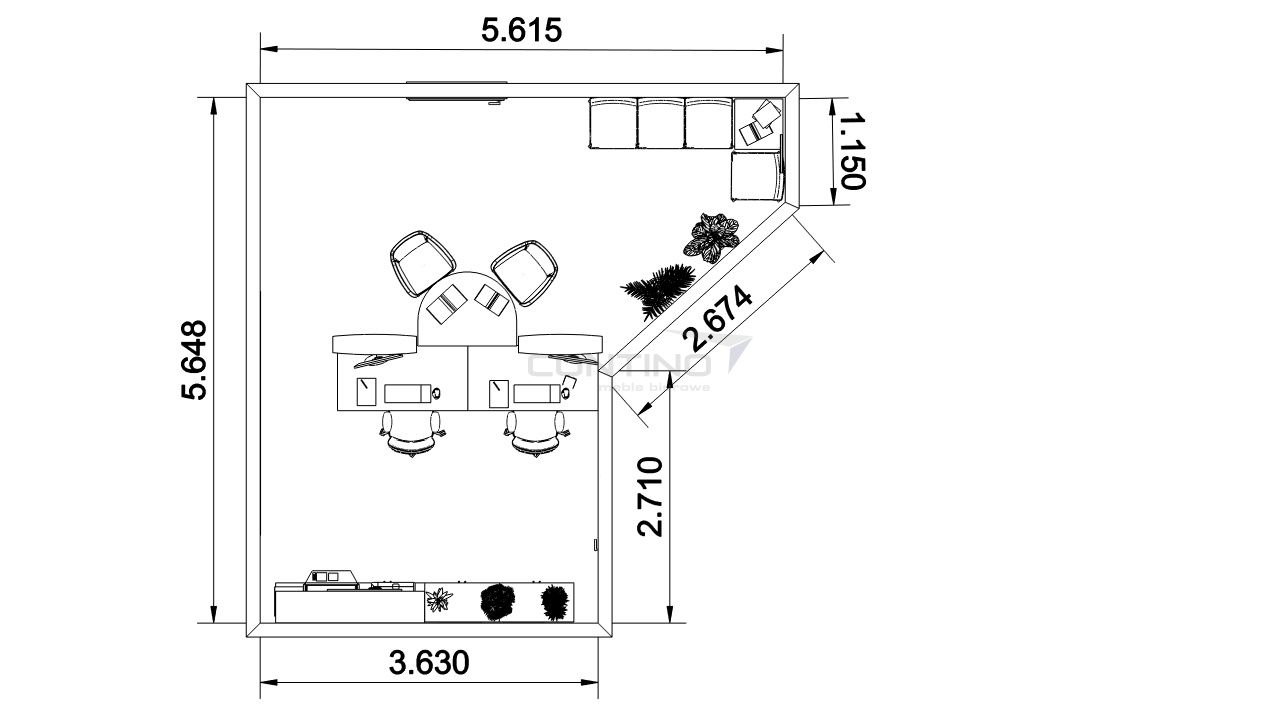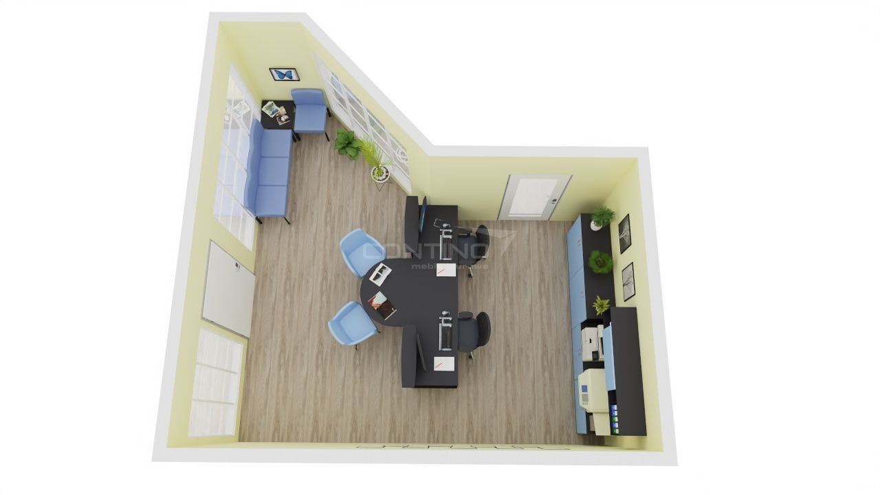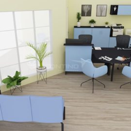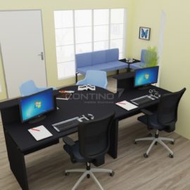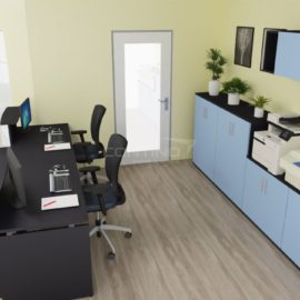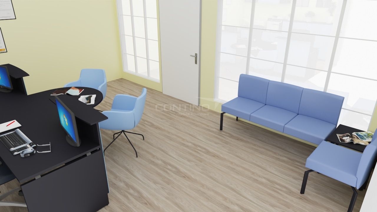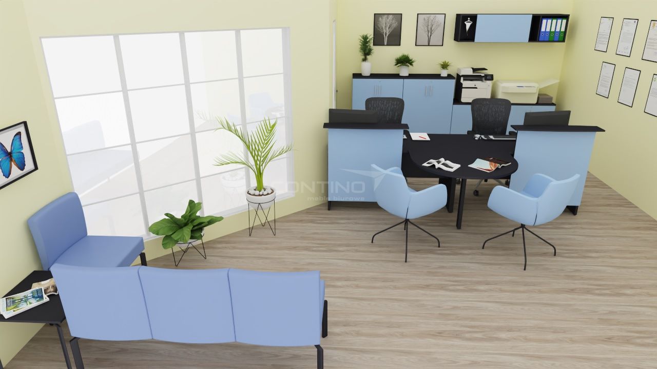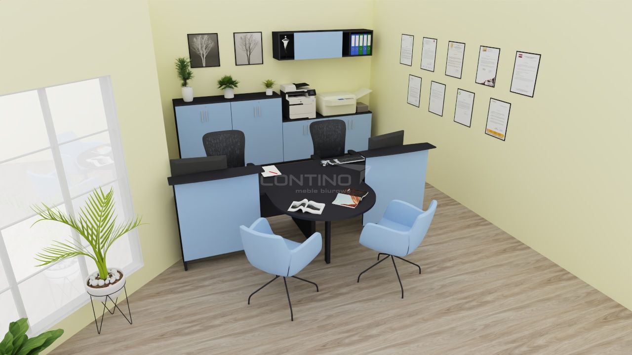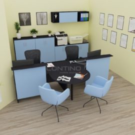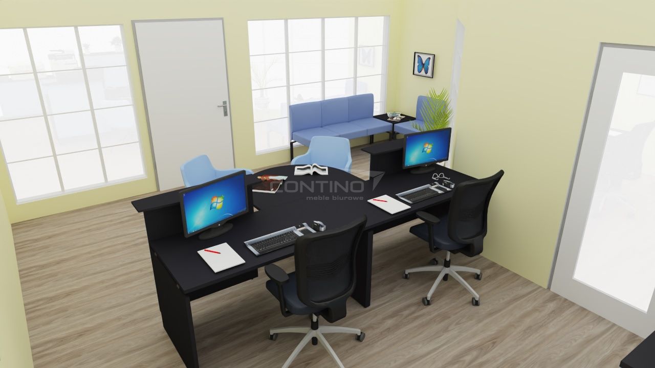 Meble do biura obsługi klienta na dwa stanowiska pracownicze. Aranżacja biura powstaje w zależności od rodzaju i przeznaczenia pomieszczeń: Punkty obsługi klienta, Recepcje – meble biurowe do biura obsługi klienta, sali obsługi klientów, meble do banków, stanowiska kasowe.